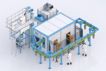 Обеспечена транспортировка изделий с помощью продольных и поперечных конвейеров, а также системы сбора и рекуперации дроби. Для работы дробеструйных сопел предусмотрен двухпостовой напорный агрегат SPK, позволяющий одновременно и непрерывно обслуживать два сопла. В системе также установлен робот-манипулятор с контроллером управления для автоматизации процесса обработки.