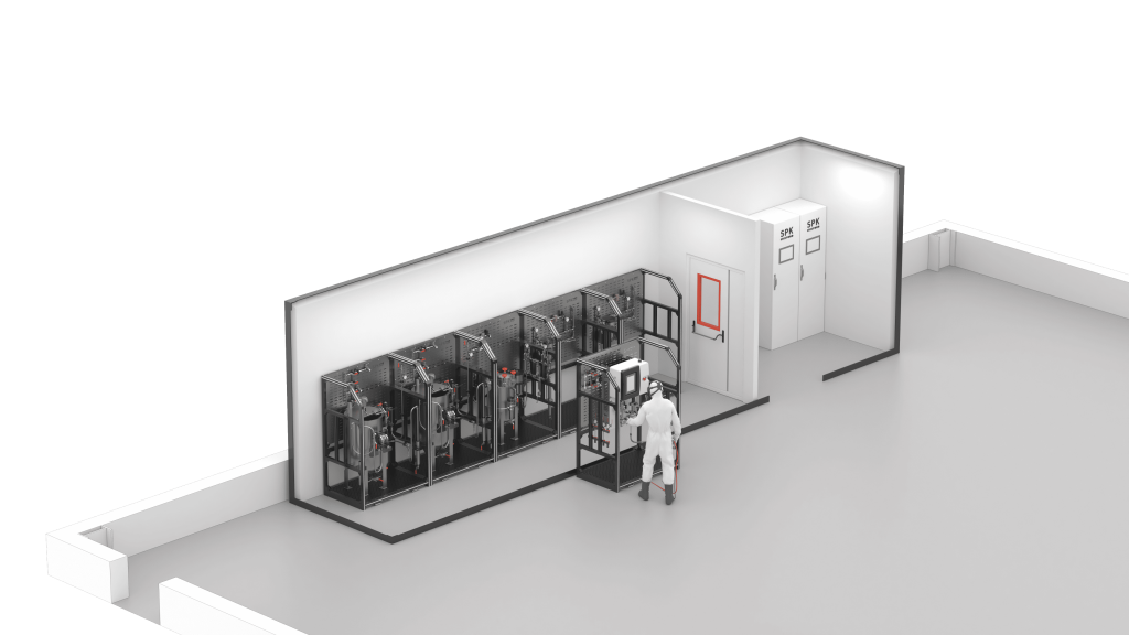 Система подготовки и подачи ЛКМ рассчитана на работу с одно- и двухкомпонентными материалами. Оборудование производится в виде модульных компонентов, прошедших предварительную сборку на предприятии SPK GROUP.